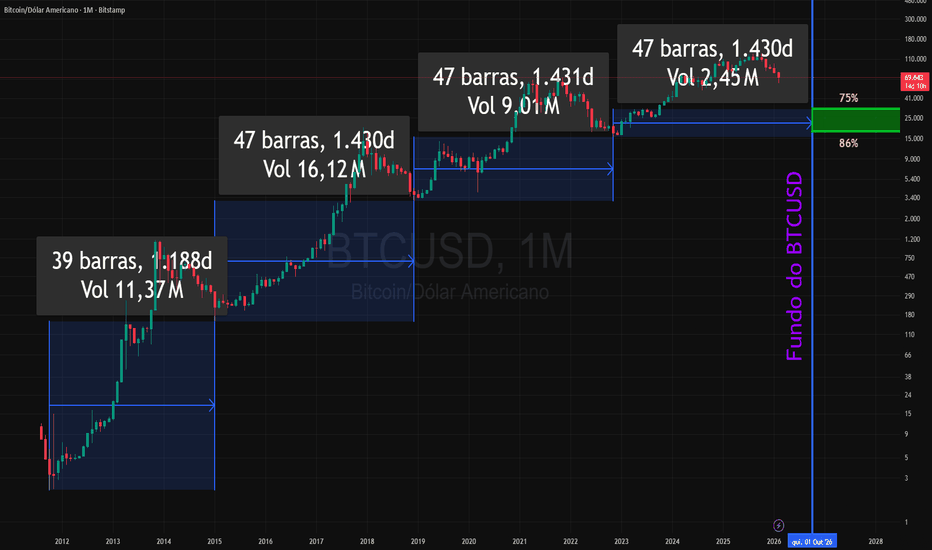 Estamos no ciclo de retração do bitcoin, como podem ver no gráfico, a cada 4 anos o BTCUSD retraí de 75% a 86% e forma um fundo a cada 47 ou