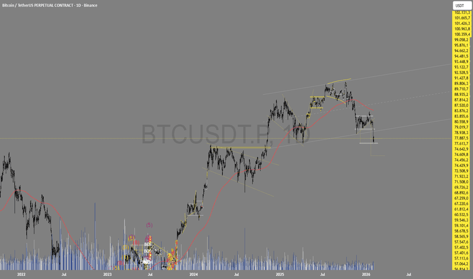 Bitcoin - Rompimento baixista, na base do canal macroO Bitcoin segue dentro de um canal de alta maior, mas o curto prazo acabou de mandar um recado importante: o canal de recuperação (microtendência de alta pós-fundo) foi rompido para baixo. E isso muda o jogo.