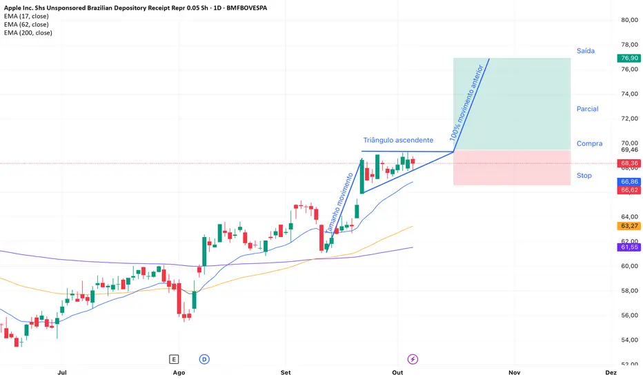 Ativo atingiu o ponto de entrada e ficou bem volátil quase chegando ao ponto de stop. Muitos ativos americanos sofreram com a fala do Trump de taxar a china em 100%. Quem não entrou na operação, melhor ficar de fora e não entrar caso o ativo atinja novamente os 69,41.Aviso legal