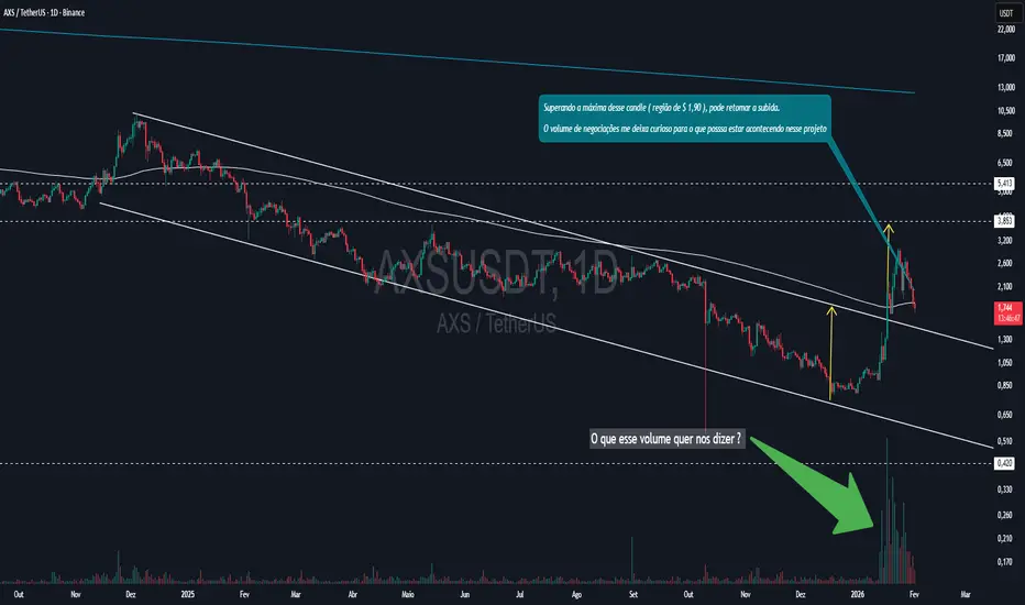 Um nível importante a ser observado é a região de $1,90, que corresponde à máxima do candle atual. Caso esse patamar seja superado, pode indicar o fim da correção e uma possível retomada de alta no curto prazo. Um fator que chama bastante atenção é o comportamento do volume. A partir de meados de janeiro de 2026, o volume aumentou de forma muito expressiva, algo que não era visto desde o início do projeto. Depois de 2022, o ativo passou longos períodos com volume muito baixo, e somente agora esse fluxo voltou de maneira relevante. Isso gera curiosidade sobre possíveis mudanças no projeto e sobre o que pode estar sendo precificado pelo mercado neste momento.