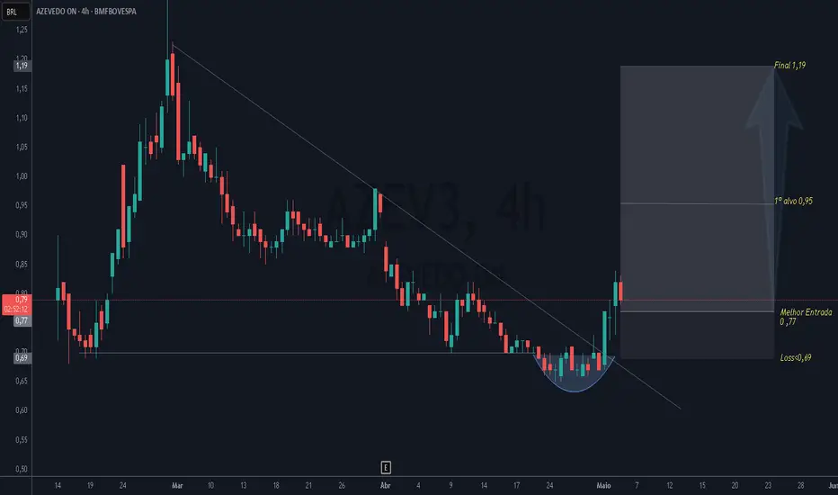 Último fundo maior que os dois anteriores, com volume com aumento de volume sustentado em H4, tem condições de su preender evoluir ate o primeiro alvo. O alcance do primeiro alvo é condição fundamental para movimentação do stop loss e buscar o alvo final.