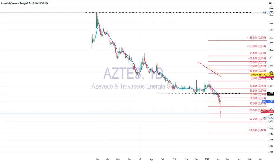 O ativo está em um cenário de pressão baixista, com suporte frágil e resistência próxima. O movimento sugere que investidores estão realizando posições ou evitando exposição. Eventuais repiques podem ocorrer, mas enquanto não houver rompimento consistente acima de R$ 0,30, o viés segue negativo.