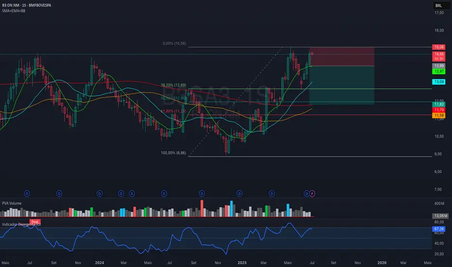 Se você entrou no rompimento da mínima da semana de 30/06/2025 (R$ 13,52), já pode colocar uma ordem de stop na região de lucro, no preço de R$ 13,20.Até o momento está com um lucro de 5,95%