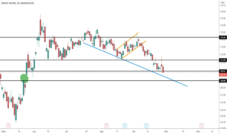 A B3SA3 depois que perdeu uma bandeira de baixa vem caindo e hoje perdeu uma região importante 29,91, logo abaixo nos 28,80 tem um gap aberto, vejo com grande possibilidade de fechar o gap