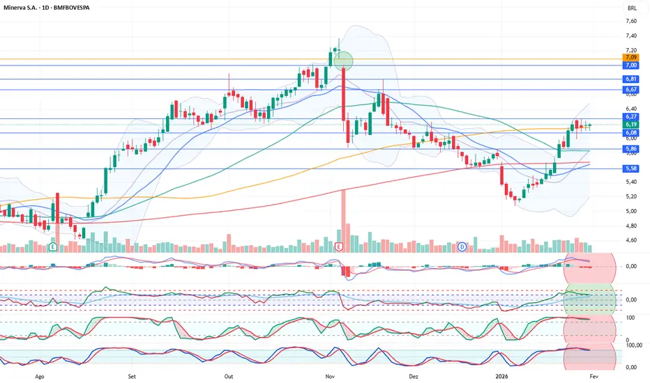 Os indicadores técnicos diários estão positivos. A ação subiu cerca de 20% desde o dia 8 de janeiro. Nos últimos quatro fechamentos diários, apresentou movimento lateral e parece não ter conseguido superar o nível de resistência em 6,27. O fato de os indicadores começarem a apontar negativamente para baixo a partir de níveis de topo pode ter aumentado o risco de uma possível realização de lucros na ação. Caso o suporte se mantenha, será necessário romper primeiramente o nível de resistência para cima e continuar os movimentos de preço acima desse patamar; caso contrário, a pressão vendedora pode se intensificar. A forte alta do índice Bovespa também pode aumentar essa pressão de venda.