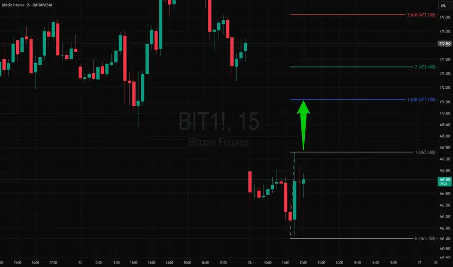 No gráfico de 5 minutos do BIT, rompeu o topo de um pivô de alta indicando a busca do(s) alvo(s) da projeção de Fibonacci, poderá acontecer uma retração antes que chegue ao primeiro alvo, isso poderá gerar um trade com retorno/risco mais favorável.