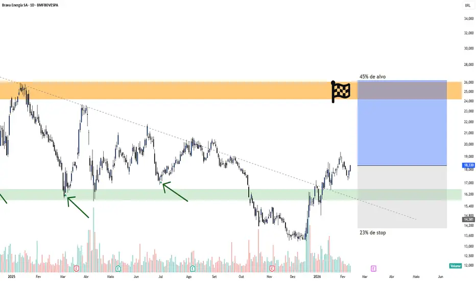 Esta leitura sugere que agora, enquanto estiver acima do Key Level verde, o ativo tende a buscar as resistências superiores. E acredito que o upside é de 40~45% por quê isso significaria um retorno à média para BRAV3 (ma200 do semanal).