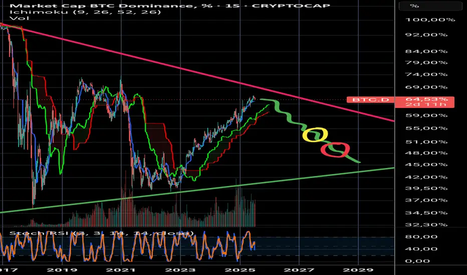 Todo ciclo começa e termina na queda e na recuperação da Dominancia do BTC. É importante acompanharmos essa variação para saber quando sair das altcoins, manter o dinheiro nas stablecoins por um tempo e retornar ao BTC no final para acumular o máximo em BTC possível que é sempre nossa meta.