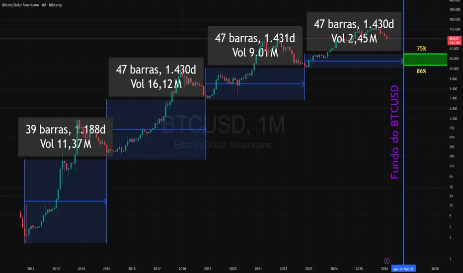 Estamos no ciclo de retração do bitcoin, como podem ver no gráfico, a cada 4 anos o BTCUSD retraí de 75% a 86% e forma um fundo a cada 47 ou 48 meses (4 anos), sendo assim, podemos prever um fundo no mês de setembro ou outubro de 2026, então é claro que ainda pode cair mais, pois todas as retrações (depois desse período de 4 anos) foram de 75% a 86%.