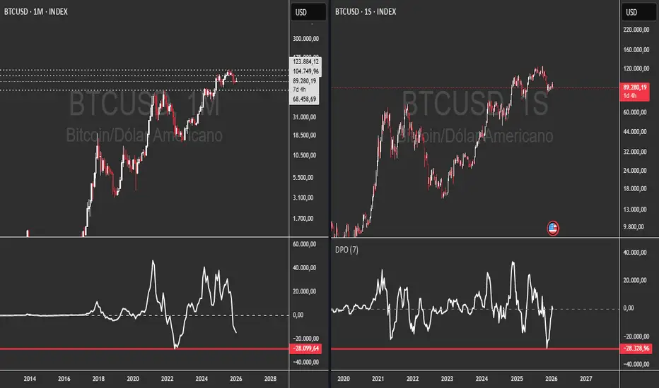 E na tela da direita, no gráfico semanal, reparem, o DPO tocou a mesma zona do gráfico mensal de Julho de 22, agora em 17 de Novembro de 25, na região dos 80k USDT.