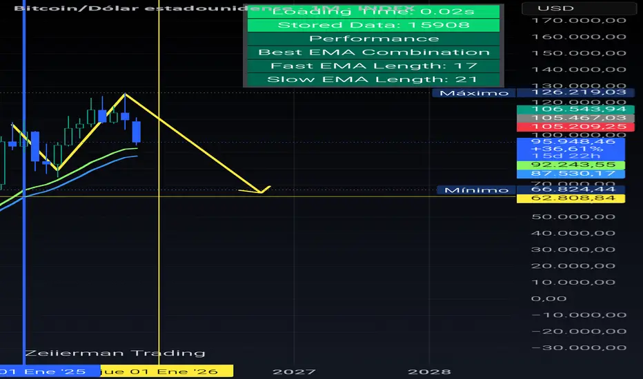 advertencia técnica clara: el cruce de EMAs (17 y 21) en el gráfico mensual de BTC/USD sugiere una posible reversión bajista a partir de mediados de 2025. El arrow amarillo no es decorativo: es una proyección visual de caída, respaldada por el comportamiento histórico del precio y la dinámica de los promedios móviles.