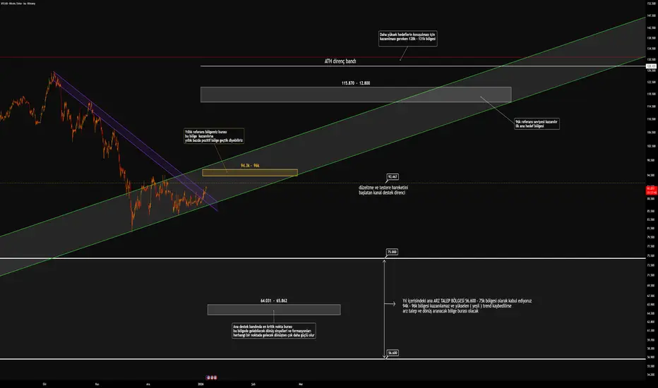 Analiz: Bitcoin (#BTC) için yıllık perspektifte teknik görünüm, "Negatif" ve "Pozitif" bölgelerin sınırlarını çizen hayati bir referans aralığına odaklanmaktadır. Grafikte sarı ile belirtilen 94.300 - 96.000 bandı, yılın kaderini belirleyecek olan ana referans bölgesidir.