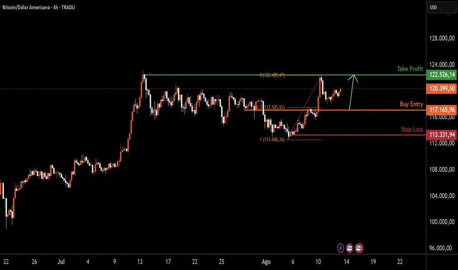 A entrada de compra está em 117.165,96, que é um suporte de pullback que se alinha com a retração de Fibonacci de 50%.