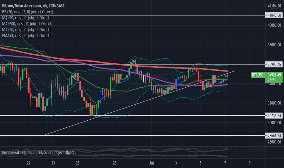 Bom dia, pessoal! O preço do Bitcoin conseguiu segurar ontem acima dos 34k, apoiado pela média móvel de 90 períodos no gráfico de H4 e tendo como barreira a média móvel de 200 que está na faixa dos 35.300. Havia a preocupação ontem que após a perda da LTA (linha de tendência de alta) o preço pudesse corrigir mais forte. Agora, a expectativa é de teste na resistência e em caso de rompimento com 35.300 deve chegar rapidamente no nível mais forte que é em 36k. Lembrando que acima de 36k o preço ganha espaço para avançar rapidamente aos 41k.
