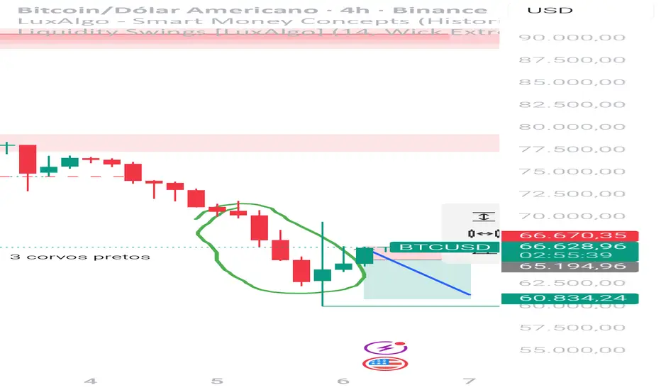 Padrão 3 corvos pretos encontrado no gráfico de 4h, indicando que a tendência de queda permanecerá.