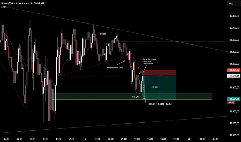 Premissa de venda após uma possível "configuração (setup) de compra ruim" onde observamos no gráfico de 15 minutos que o comportamento recente das barras de alta, não chegam tocar a média móvel exponencial de 20 períodos, demonstrando força dos vendedores. O movimento de alta que ocorreu após o último fundo recente (18/06/2025) forma uma estrutura de Wedge que vem deixando topos mais baixos. Eu observei o ciclo deste movimento, que tende a ser uma bandeira de baixa, e com a confirmação do rompimento e canal, (spike and channel), observamos esta força das barras de venda no canal, em busca de um possível alvo, que esta marcado como GAP desta movimentação. Ao notar um padrão de Wedge de fundo, marquei uma venda no fechamento da segunda barra de alta, que seria a barra de entrada dos compradores de H1 após wedge de fundo, que se demostrou uma péssima compra, mostrando desistência e seguindo para o alvo de GAP.