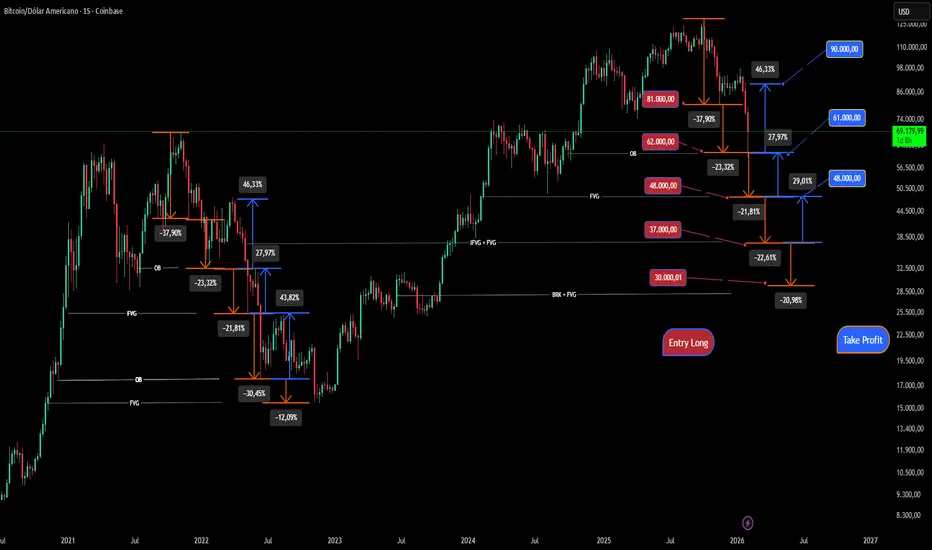 Esses alvos refletem pullbacks técnicos típicos de Bear Market, assim como ocorreu em 2022.