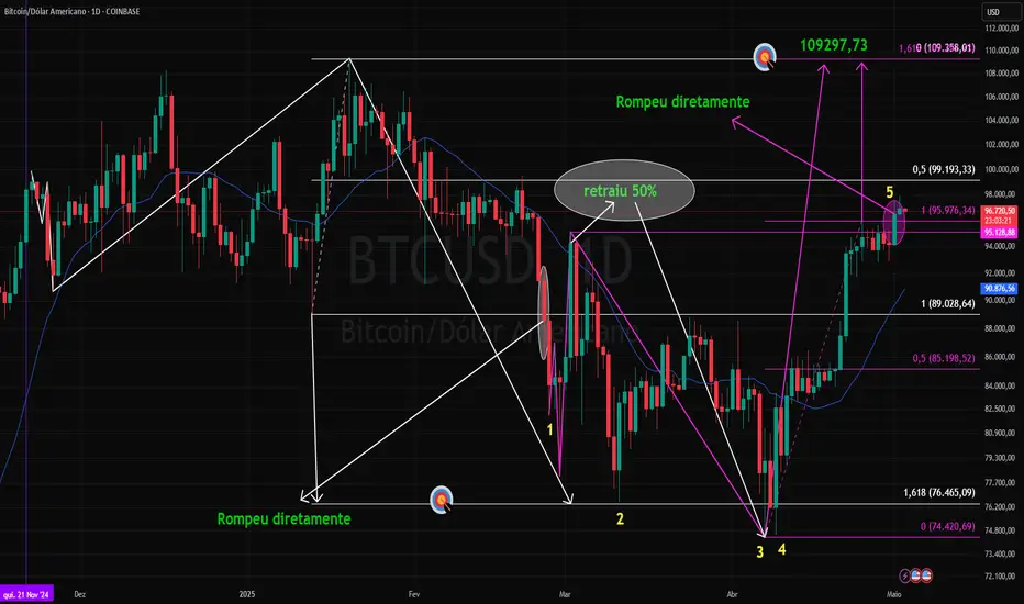 No gráfico diário do BTCUSD COINBASE, rompeu o range da acumulação da retomada da tendência de alta.