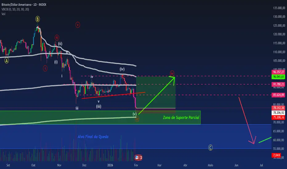 Depois de um mini crash de 20% acredito que o bitcoin atingiu uma zona de suporte parcial ao mesmo tempo que está esticado na venda (sobrevendido). Também por ondas de Elliott um padrão de onda 3 de queda parece ter se completado o que deve ser seguido de uma onda 4 pra cima. Existe a possibilidade de alta de até 22%, ou seja, um pullback de quase toda a queda dos últimos dias.