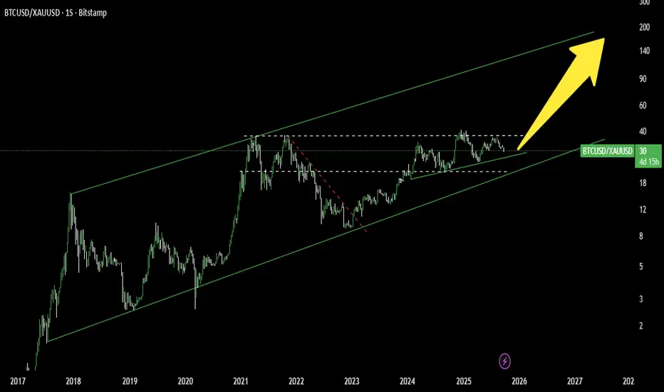 Cotação do bitcoin em OURO (BTCXAU) , podemos ver que desde 2017 o bitcoin segue dentro de um canal de alta, e desde 2024 segue dentro de uma estrutura de alta.