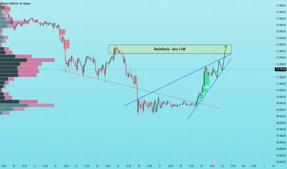 O Bitcoin (BTC) na corretora BINANCE mantém um momento positivo de recuperação, sendo atualmente negociado a cerca de 112.050 USDT. No gráfico de 1H, o preço rompeu a linha de tendência de baixa e formou uma estrutura de cunha ascendente, indicando um poder de compra avassalador.