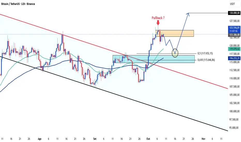 Com base na análise técnica, o BTCUSDT rompeu fortemente o canal descendente. Atualmente, o Bitcoin enfrenta uma forte resistência perto do nível dos 124.000 dólares. Após atingir o pico, o preço pode corrigir de volta para os níveis de suporte de Fibonacci (0,5 - 0,618) antes de potencialmente continuar o seu movimento de alta.