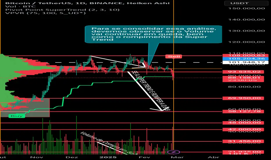 mas temos a pivô super trend que está a 3 meses (1 dez 2024 até 22 fev 2025) abaixo desse preço e pode ser rompida a qualquer momento. alguma coisa está para acontecer como um short. porque o volume de compra está caindo e é assim que analisamos de uma maneira macro.