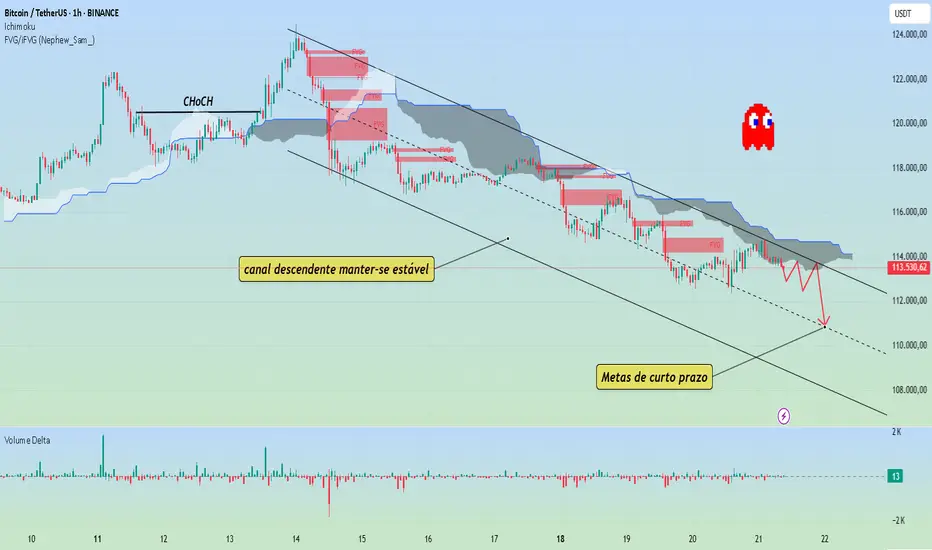 O BTCUSDT está em torno de 113.400, com o preço a ser continuamente rejeitado na Nuvem de Ichimoku e a resistência no canal de tendência de baixa. O FVG ainda não foi preenchido, demonstrando ainda mais a predominância da pressão de venda.