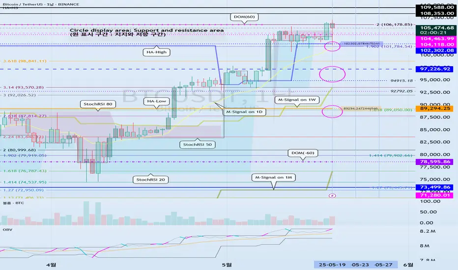 104984.57 부근에서 지지 받는 모습을 보이게 되면, 상승할 가능성이 높지만, 변동성 기간이 5월 20일까지 (최대 5월 28일) 진행되기 때문에 지지 여부를 확인하는 것이 좋습니다.