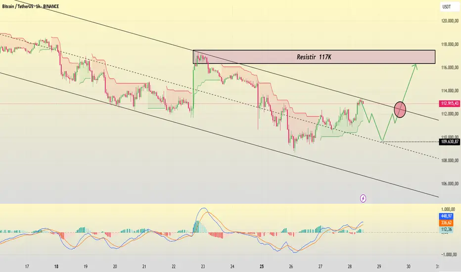 O Bitcoin (BTCUSDT) ainda está a ser negociado num canal de tendência de baixa. No entanto, o momentum de recuperação a partir do fundo de 109.000 a 110.000 mostra que a tendência de baixa enfraqueceu. O gráfico H1 mostra que o BTC está a aproximar-se da importante resistência nos 117 mil.
