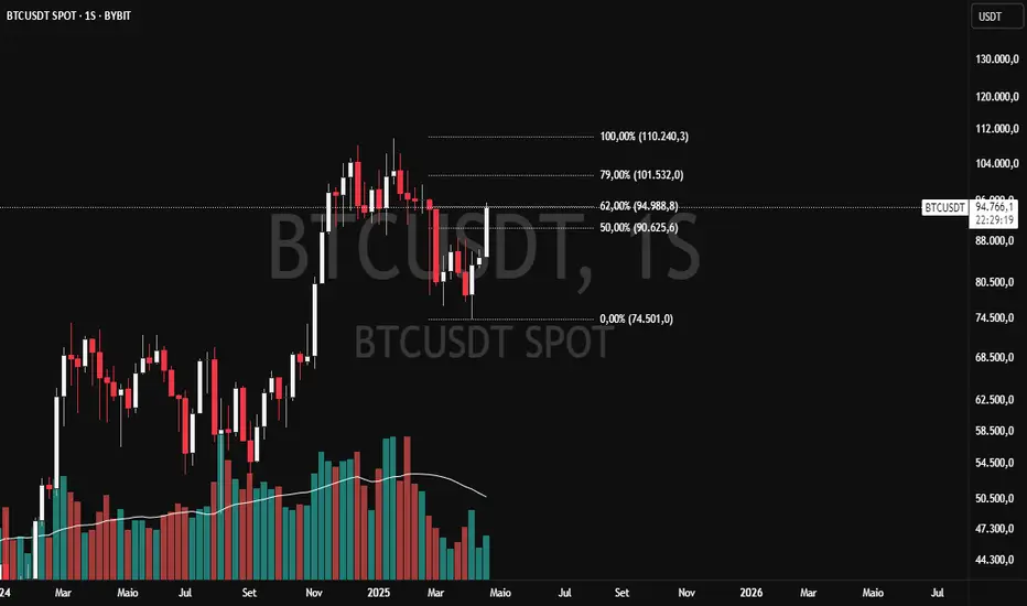 Analisando o gráfico semanal do Bitcoin, estamos exatamente na região de 0.618 de Fibonacci de topo a fundo semanal como podem ver no gráfico.