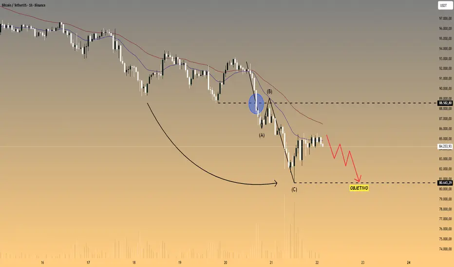 Esta semana, BTC continúa moviéndose según la estructura decreciente a corto plazo. Después del retroceso a la zona (B), donde convergen la EMA y la resistencia horizontal, el precio rechazó fuertemente y volvió a caer para crear una onda completa A → B → C.