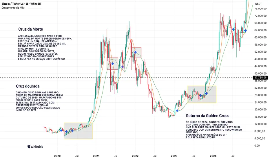Porque eles nos ajudam a contextualizar o sentimento do mercado. A cruz dourada e a cruz da morte refletem a psicologia coletiva dos comerciantes — otimismo e medo. Mas, para realmente entendê-los, precisamos combiná-los com volume, estrutura de mercado e narrativas macro.