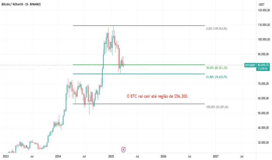 Observando as ondas de eliot no semanal que o btc fez e aplicando a projeção de fibo, prevejo que o BTC vem cair até a região de preço de $56.300.