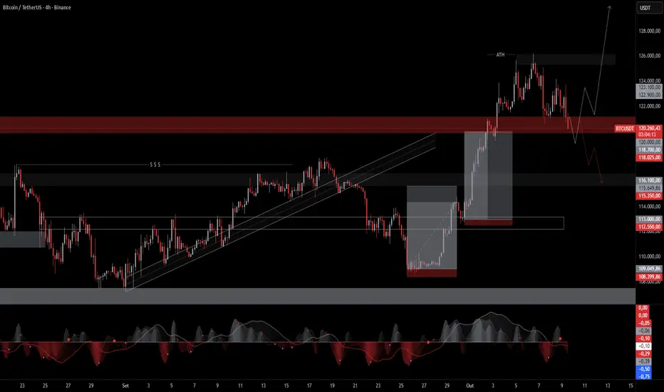 Deve haver entre hoje e amanhã uma captura de liquidez próximo a US$ 119.000 abaixo do suporte dos US$ 120.000, e após isso um pullback de alta que caso haja notícias desfavoráveis ao dólar amanhã no payroll (foi adiado de 03/10 para 10/10), podemos ter um impulso para uma possível nova ATH próximo a US$ 130.000.
