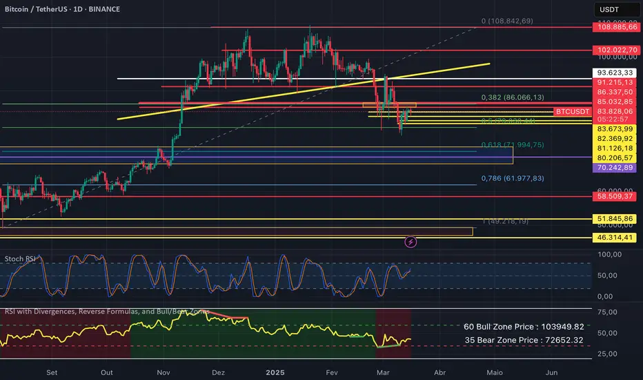 Por via de regras, o topo da região atual em 86300 não pode ser violada de modo a retomar a alta, para que a queda continue acontecendo em direção a região de 70-74 mil dólares. Caso aconteça o rompimento, podemos ver o Bitcoin buscar os 88-89 mil em pouco tempo. No D1 temos a ema200 bem na região de resistência atual, segurando o preço abaixo dos 86k.