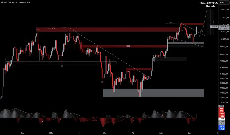 Mais uma análise certeira time, não estamos pra brincadeira! #BTC buscando a região dos US$ 110.000 como mencionado e gerando liquidações e stops de posições shorts.