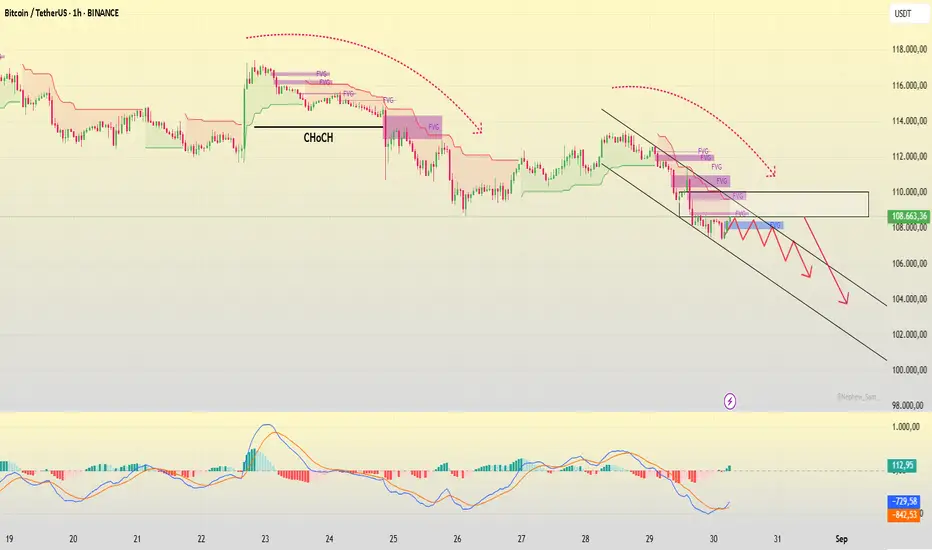 Bitcoin continúa moviéndose en el canal de tendencia bajista, con recuperaciones débiles que se rechazan rápidamente en la zona de oferta alrededor de 110.000. En el gráfico H1, la estructura de precios muestra una clara debilidad, formando continuamente máximos decrecientes y manteniéndose por debajo de la línea de tendencia bajista. El MACD se mantiene por debajo del umbral de equilibrio, lo que indica que el impulso de venta no se ha desacelerado.