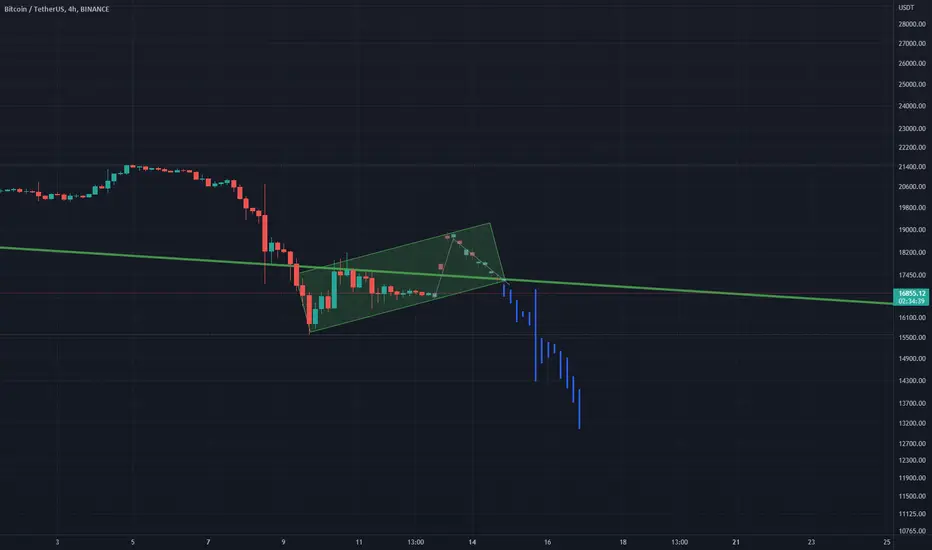 Projeção dos próximos movimentos do BTC com possível alta temporária e queda com entrada no rompimento do suporte da bandeira. projeção do tamanho do mastro.