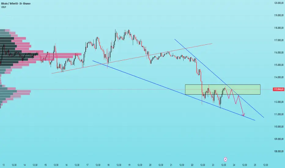 O BTCUSDT após um ritmo de recuperação curto está se movendo corretamente no cenário técnico reduzido. No quadro H1, o preço ainda está no modelo de cunha diminui, constantemente retocando e depois girando. O preço de 113.000 - 113.500 USDT é atualmente uma resistência importante quando combinada com a liquidez e a área de suprimento anterior.