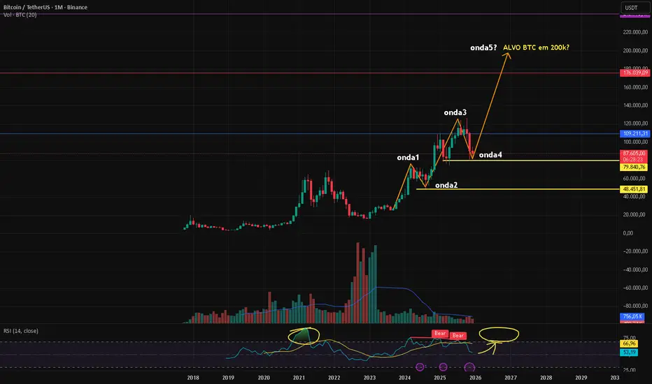 Coloquei as possíveis ondas de Elliot no mensal do BTC, se tudo der certo e o Trumpstein parar de roubar e manipular os mercados, o BTC tem chão para fazer a última onda5 chegando a 200k ou perto disso em 2026.