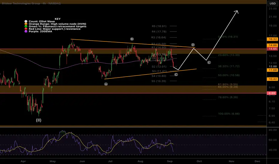 Until we get a break below wave (A) or a above wave (B) the analysis is good. Will readjust and update if anything changes. A breakdown below the triangle has a wave 2 target of the golden pocket Fibonacci retracement and HVN support at $9.63 and may offer a great buying opportunity.