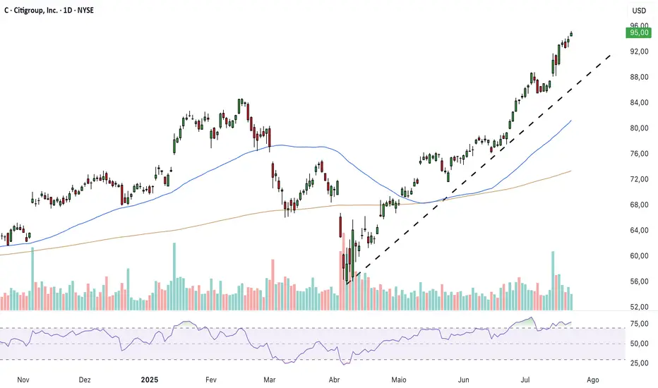 Tecnicamente, o preço das ações do Citi disparou para novas máximas de tendência, apoiado por fortes volumes. A ação mostrou um impulso significativo, traçando uma linha de tendência ascendente sólida. No entanto, com o RSI em território de sobrecompra, os traders podem querer esperar por um recuo para um ponto de entrada mais favorável. Uma consolidação ou uma leve queda pode oferecer uma melhor configuração de risco/recompensa para aqueles que desejam se envolver.