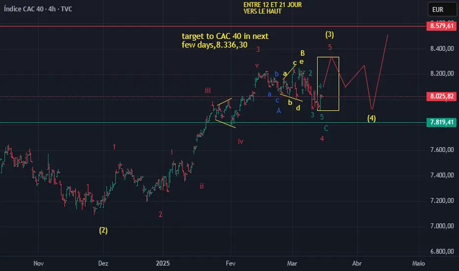 The CAC40 will rise in the next few days to the level of 8,333.30, marking a top of wave 5 of 3, following a correction of several days, the dates of March 21 and April 2 should be observed with great attention.