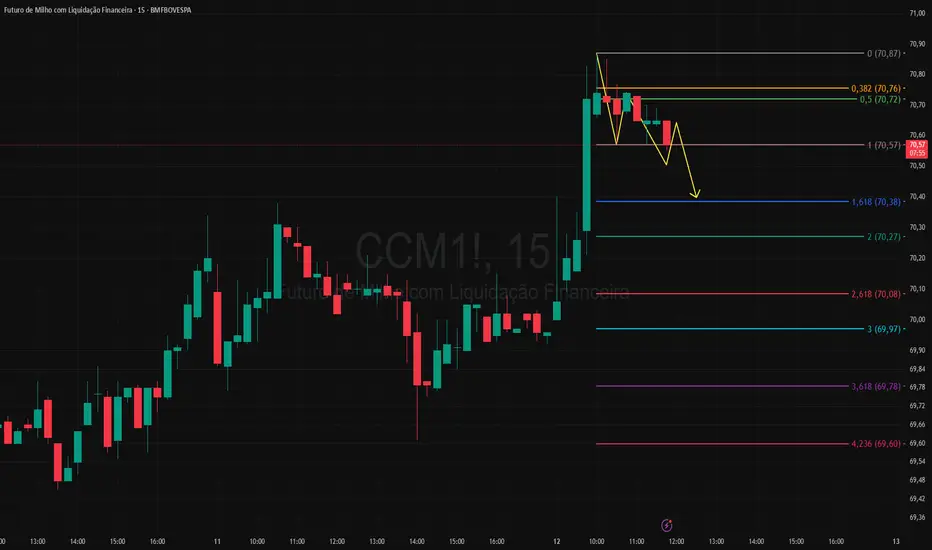 No gráfico de 5 minutos da CCM1!, rompeu um pivô de baixa indicando a busca do(s) alvo(s) da projeção de Fibonacci, poderá retrair gerando um trade com retorno/risco mais favorável.