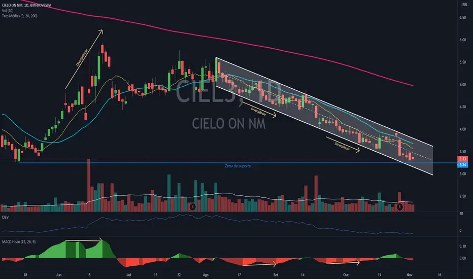 Cielo segue em tendência de baixa com os preços respeitando esse canal paralelo. Em alguns pontos é possível observar divergências de classe A e B de acordo com o Histrograma MACD. Atualmente o papel atingiu uma zona de suporte bem relevante e segue negociado abaixo das médias móveis de 09, 20 e 200 períodos. É provável que papel siga lateral por algum tempo até ditar uma nova tendência ou confirmar ainda mais a queda. A princípio seria uma boa opção de compra, baseado no contexto, porém é importante aguardar a confirmação dos movimentos, por meio da formação de um pivot de alta ou de baixa.