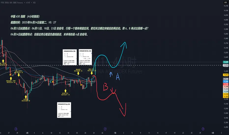- 自6月13日起,A50指数连续在6月13日、18日、23日三次出现关键信号,整体走势围绕这三点构建了一个明显的横盘整理区间。