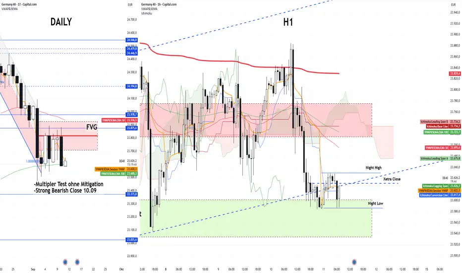 – Trendstruktur: H1 schwacher fast gebrochener Aufwärtstrend, Daily FVG-Bereich 23.710–23.930 als Widerstand