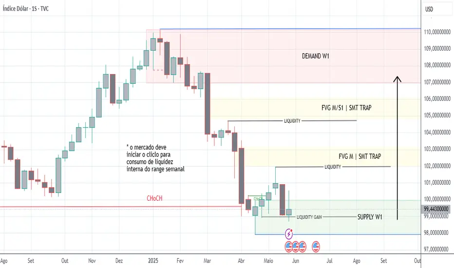 Analisando o DXY dentro do padrão SMC é possível notar uma possível reversão para capturar toda liquidez interna deixada desde o final de dezembro de 2024, para confirmar este viés macro estrutural o preço precisa romper 100,540 mas já tivemos um ganho de liquidez semanal onde deveremos esperar por altas na próxima semana.