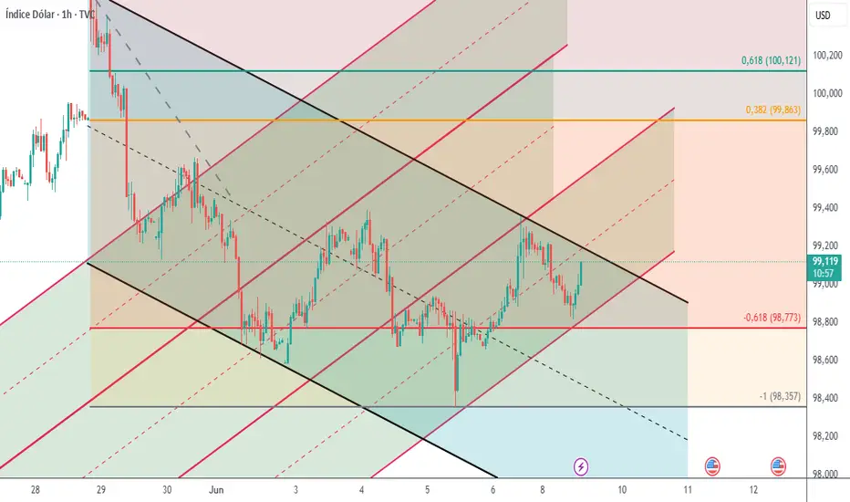 📈 O movimento atual indica tentativa de retomada de força compradora, mas o índice encontra resistência técnica na faixa dos 99,320 – 99,400, onde há confluência entre Fibonacci (38%) e estrutura do canal.